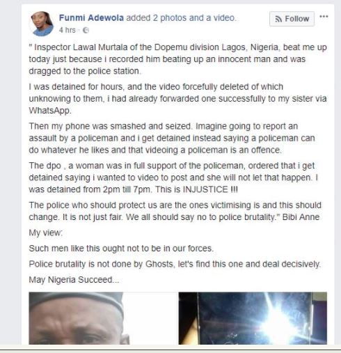 "Inspector Lawal Murtala of the Dopemu division Lagos, Nigeria, beat me up today just because i recorded him beating up an innocent man and was dragged to the police station.