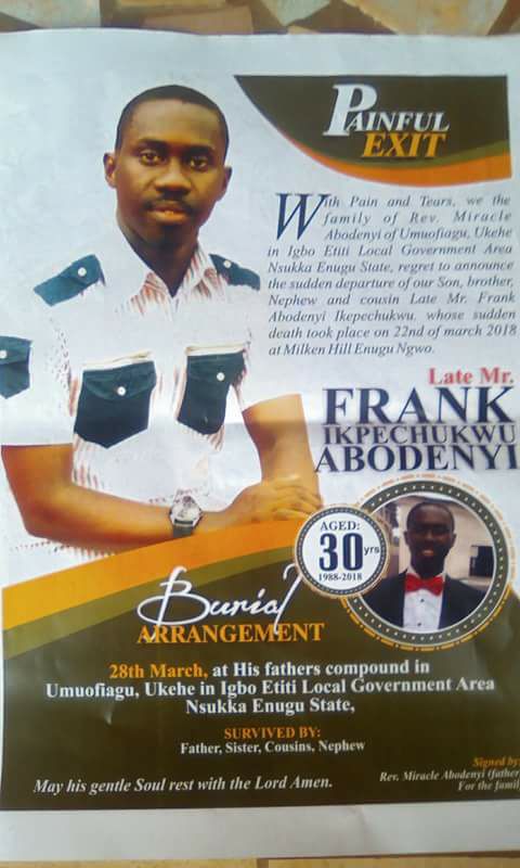 You were killed carelessly by men of NSCDC Enugu unit that fired at a bus in which you were inside as a passenger for breaking road traffic laws, the bus felled inside a big dish of Milkinhill near New Market Enugu and you died.We are working on bringing justice to you to caution this heartless armed men wearing security clothes,as you will be laid today at your Umuofiagu village I pray for your soul to rest in peace. Adieu Ikpechukwu Frank Abodeny"
