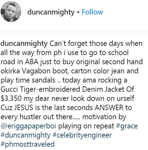 Duncan Mighty recently took to his Instagram page to share a testimony about how far he has come and how God has changed his life. He revealed that a long time before fame and success, he used to go all the way from Port Harcourt to Aba just to buy fairly used clothes but that now he us able to wear extensive clothes.