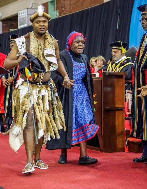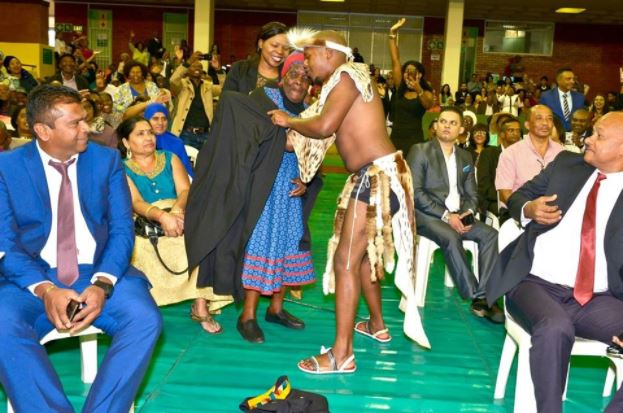After being called to the podium, Njabulo, caused a stir by removing his gown, changing into his Zulu traditional dress, then made 89-year-old Nomkikilizo wear the gown instead. He then took her to the podium.
